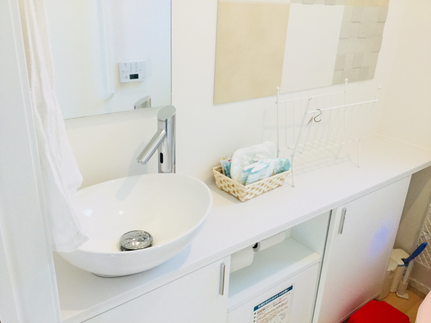 タンクレスにすると手洗い場がないため、オプションで棚の上に設置しました。