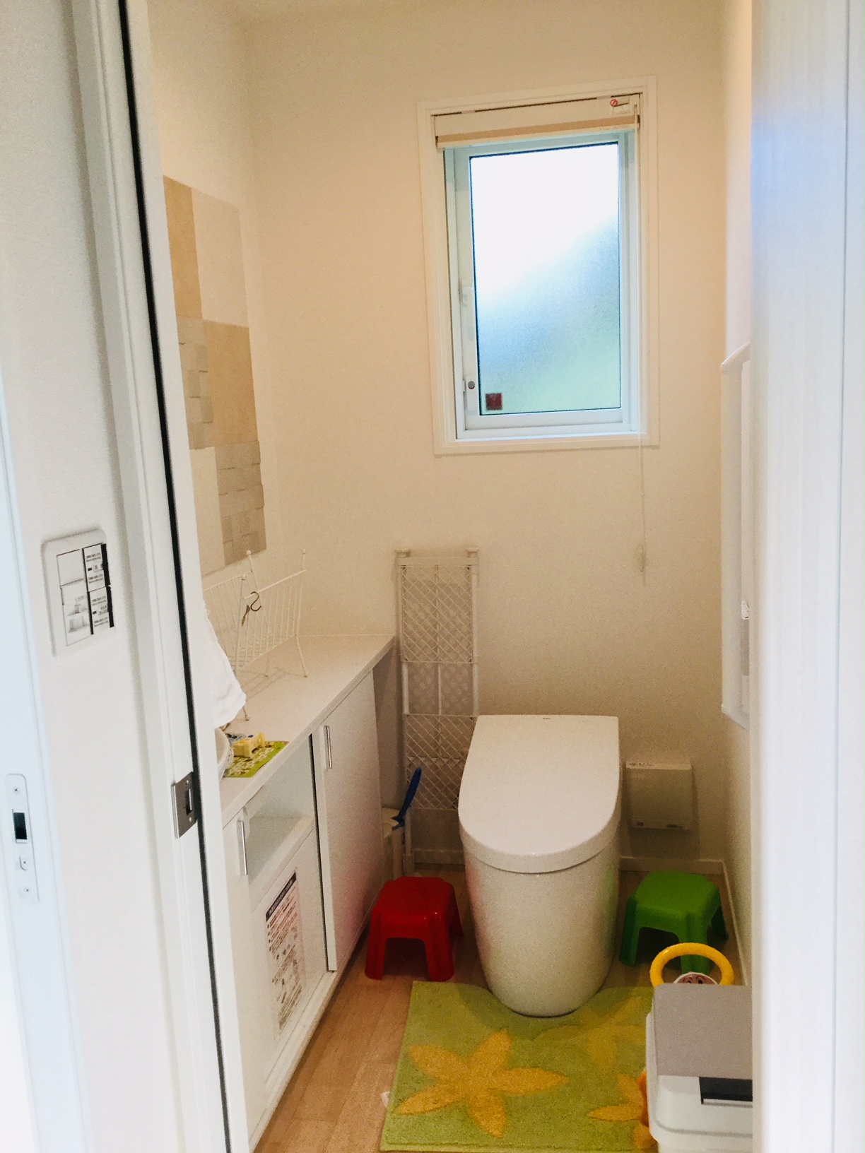 トイレには換気扇がある!ということで、おむつ用のごみ箱もトイレ内に設置(右下)。大きめに作ったので幅がありますが、タンクレスのために奥行きもあり、かなりスペースにゆとりがあります。