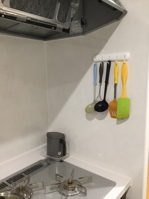 が、吊戸棚がないと、その下にくっつけるようなタイプの収納器具が軒並み使えなく…!(>_<)洗い物の後などに困惑しています。突っ張り棒的な何かで、棚を作ってあげるのはアリなのですが、何しろキッチン上は広いですからね。突っ張る距離が長すぎて、ちょっと難しそうです。